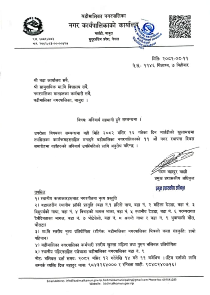 बाजुराः बडीमालिका नगरपालिकाले नगर स्थापना दिवस विविध कार्यक्रम गरेर मनाउने भएको छ।स्थापना दिवसका अवसरमा नगरपालिकाले स्थानीय संस्कृति झल्किने कार्यक्रमको आयोजना गर्ने भएको हो।