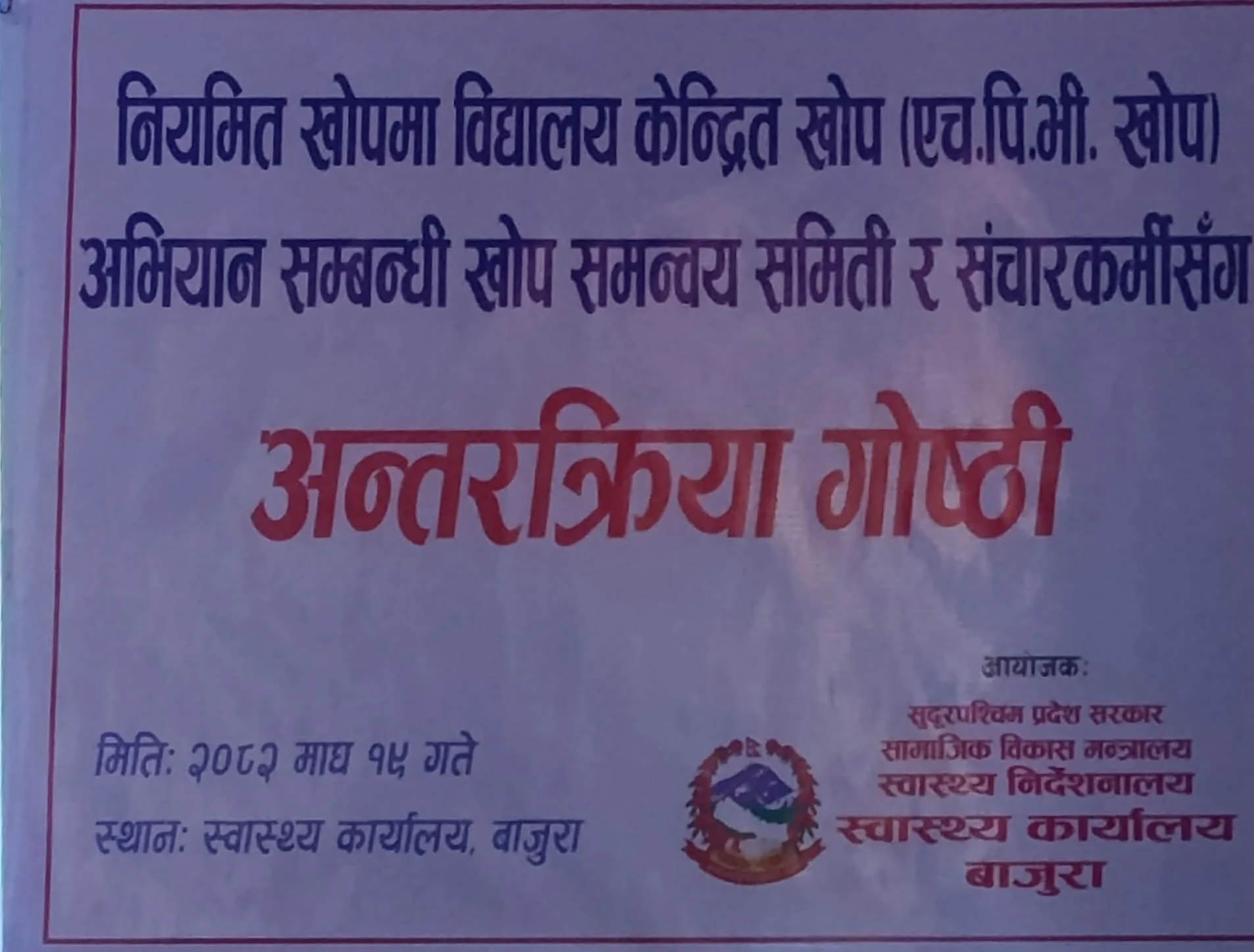 साेमबार मार्तडीस्थित जिल्ला स्वास्थ्य कार्यालय बाजुराकाे सभाहलमा नियमित खाेपमा विद्यालय केन्द्रीत (एचपिभी) खाेप सम्बन्धी अन्तरक्रिया कार्यक्रम गरिएको हाे।राष्ट्रिय खोप कार्यक्रम अन्तर्गत क्यान्सर राेग बिरुद्धकाे एच.पि.भी खोप अभियान बाजुरामा माघ २७ देखि फागुन ३ गतेसम्म सञ्चालन हुन लागेको स्वास्थ्य कार्यालय बाजुराले जनाएको छ ।