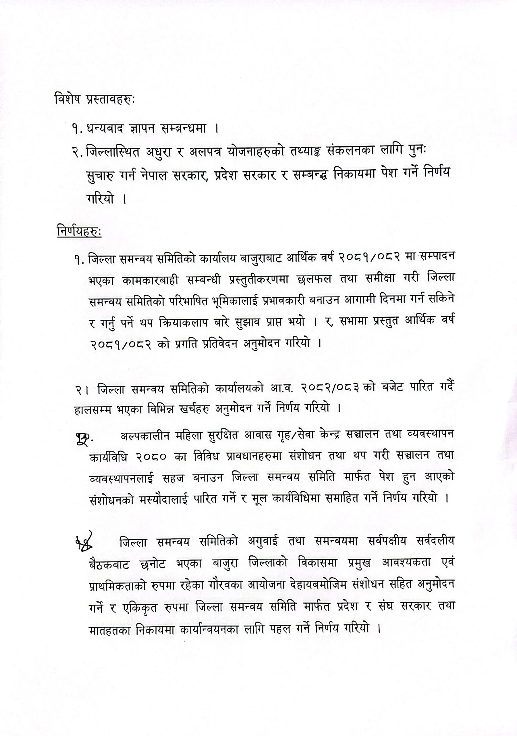 त्यस्तै सभाले फागुन २१ गते सम्पन्न प्रतिनिधि सभाकाे निर्वाचनलाई स्वच्छ,निष्पक्ष र भयरहित वातावरणमा सम्पन्न गर्न सहयाेग गर्ने सम्पूर्ण सम्बद्ध निकायलाई धन्यवाद ज्ञापन गरेकाे छ ।साथै जिल्लास्थित अधुरा र अलपत्र याेजनाकाे तथ्यांक संकलकाे लागी पुन: सूचारु गर्न नेपाल सरकार,प्रदेश सरकार र सम्बद्ध निकायमा पेश गर्ने निर्णय समेत गरेकाे हाे।