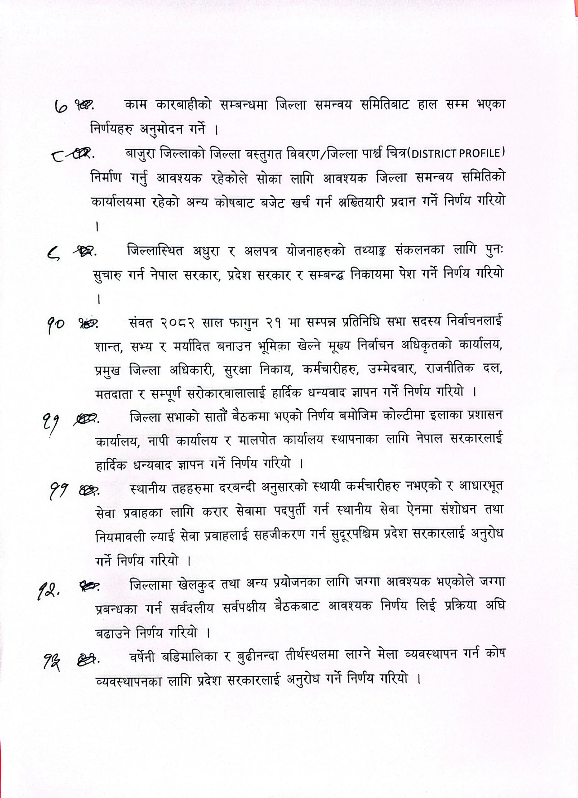 जिल्लामा खेलक्षेत्रकाे विकासका लागी खेल तथा अन्य प्रयाेजनका लागी जग्गा आवश्यक भएकोले जग्गा प्रबन्ध गर्न सर्वदलिय सर्वपक्षीय बैठकबाट आवश्यक निर्णय लिई प्रक्रिया अघि बढाईने,बर्षेनी बडीमालिका र बुढिनन्दा तिर्थस्थलमा लाग्ने मेला व्यवस्था गर्न काेष व्यवस्थापनका लागी प्रदेश सरकारसंग अनुराेध गर्ने लगायतका निर्णय गरिएका हुन्।