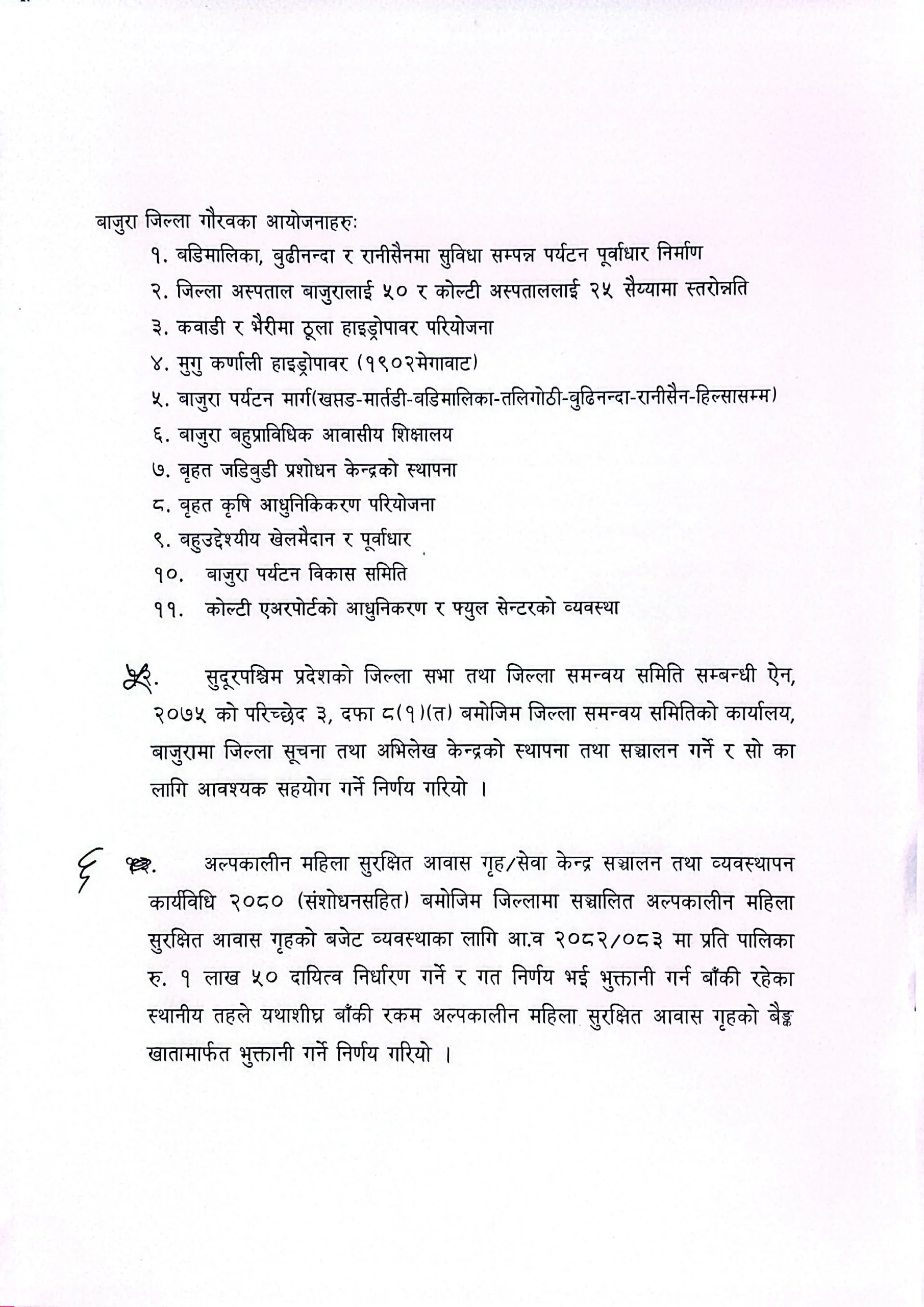 बाजुरा जिल्लामा अवस्थिति बडीमालिका,बुढिनन्दा, रानीसैन,त्रिवेणी,नाटेश्वरी लगायतका धार्मिक तथा पर्यटकीय क्षेत्रकाे पर्यटन,प्रबर्द्धनका साथै पर्यटन पूर्वाधारको व्यवस्था गरी दिन सरकारसँग अनुरोध गरिने जनाएको हाे।