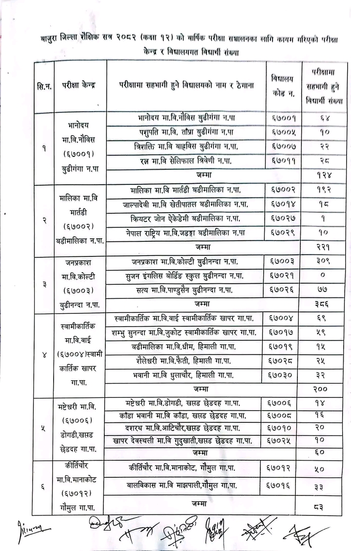 शिक्षा विकास तथा समन्वय इकाई बाजुराले कक्षा १२ को वार्षिक परीक्षा साे संख्याका विद्यार्थी सहभागी हुने जनाएको छ।जिल्लाभर कक्षा १२ को वार्षिक परीक्षा सञ्चालनका लागि ८ वटा परीक्षा केन्द्र तोकिएको छन्।