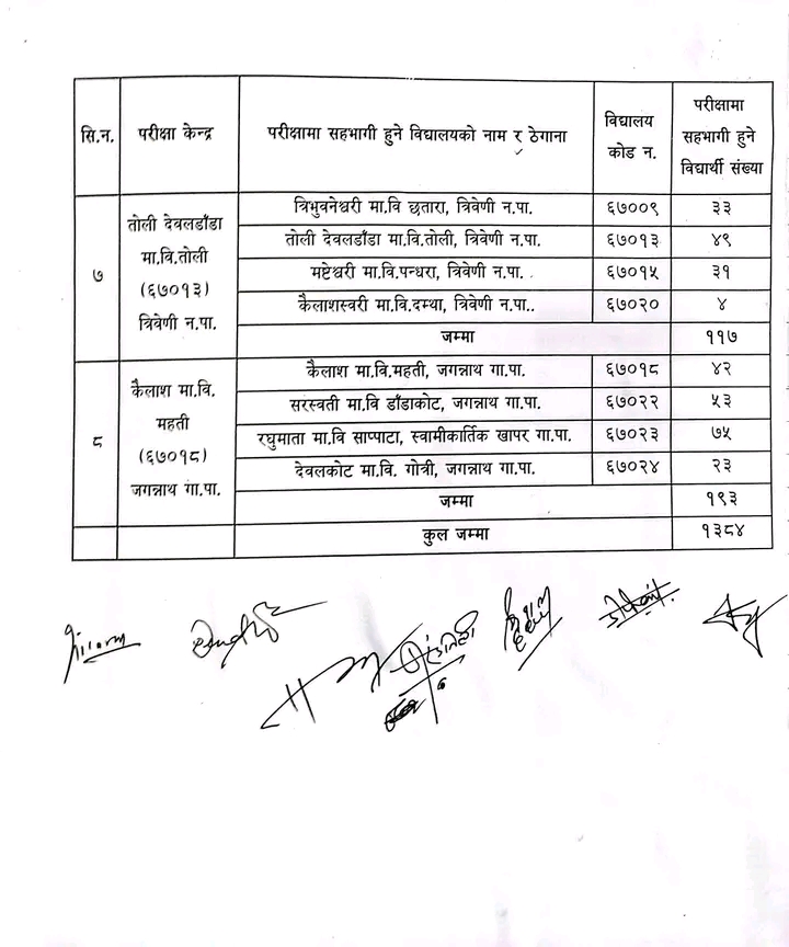 त्यस्तै स्वामिकार्तिक मावि वाई परीक्षा केन्द्रबाट ५ विद्यालयका दुई सय,मष्टेश्वरी मावि डाेगडीबाट ४ विद्यालयका ६०,किर्तिचाैर मावि कालादह परीक्षा केन्द्रबाट २ विद्यालयका ८३,ताेली देवल डाँडा मावी ताेलीबाट १ सय १७ र कैलाश मावी महती परीक्षा केन्द्रबाट १ सय ९३ गरि कुल १ हजार ३ सय ८४ परिक्षार्थी सहभागी हुने छन्।